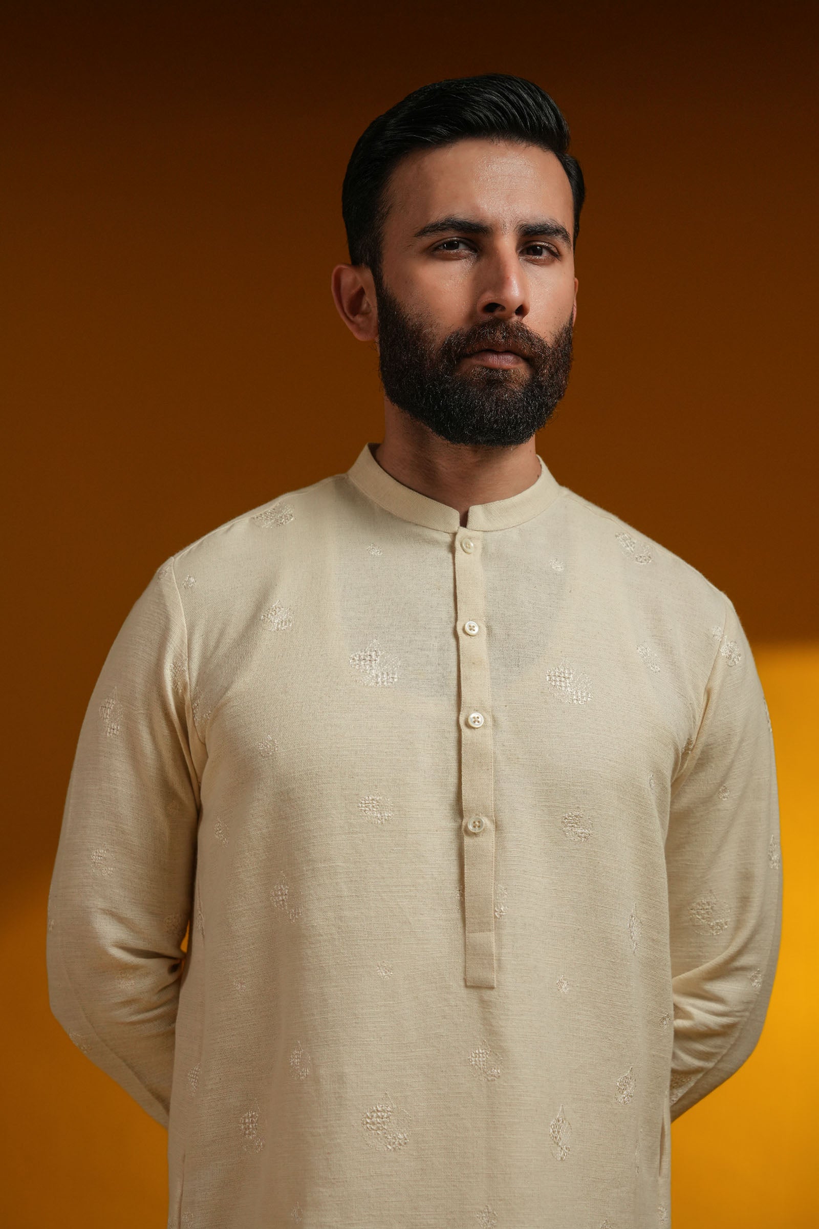 Basant in Lahore is more than a festival—it’s a feeling. This handloomed kurta–trouser suit captures that emotion through all-over embroidered kite motifs inspired by lively rooftops and open skies. Designed with a mandarin collar, button placket, kurta sleeves, and a straight hem, the regular-fit kurta pairs seamlessly with straight-leg trousers. Light, breathable, and festive, it’s made to move with the season.