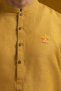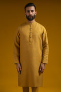 Inspired by Lahore’s beloved Basant, where golden sunlight, open skies, and flying kites set the mood for celebration. This handloomed kurta–trouser suit reflects the joy and tradition of the season, elevated with delicate embroidered kite detailing on the front left pocket—a subtle nod to Basant’s most iconic symbol. The long kurta features a mandarin collar, classic button placket, Kurta sleeves, and a straight hem, paired with straight-leg trousers for a clean, refined silhouette. Light, festive, and effortlessly elegant, it is designed for rooftop gatherings, daytime festivities, and Basant celebrations.