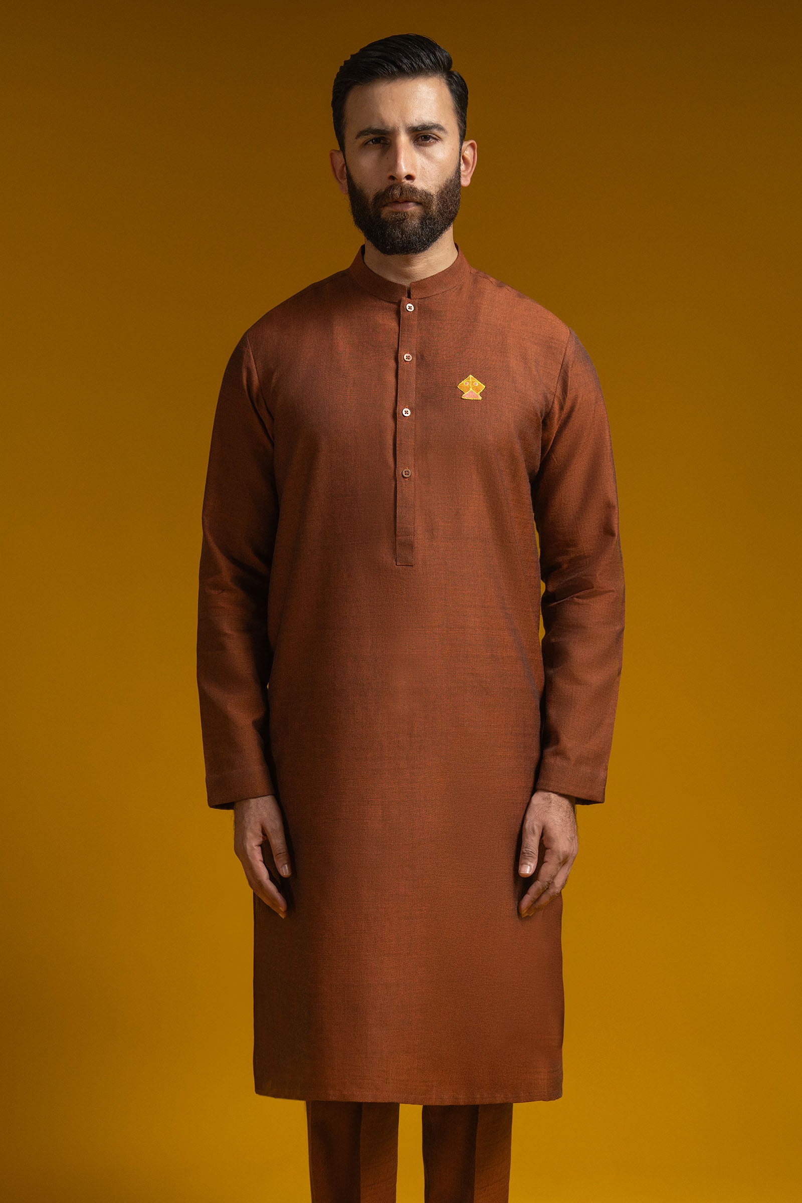 Inspired by Lahore’s beloved Basant, where golden sunlight, open skies, and flying kites set the mood for celebration. This handloomed kurta–trouser suit reflects the joy and tradition of the season, elevated with delicate embroidered kite detailing on the front left pocket—a subtle nod to Basant’s most iconic symbol. The long kurta features a mandarin collar, classic button placket, Kurta sleeves, and a straight hem, paired with straight-leg trousers for a clean, refined silhouette. Light, festive, and effortlessly elegant, it is designed for rooftop gatherings, daytime festivities, and Basant celebrations.