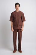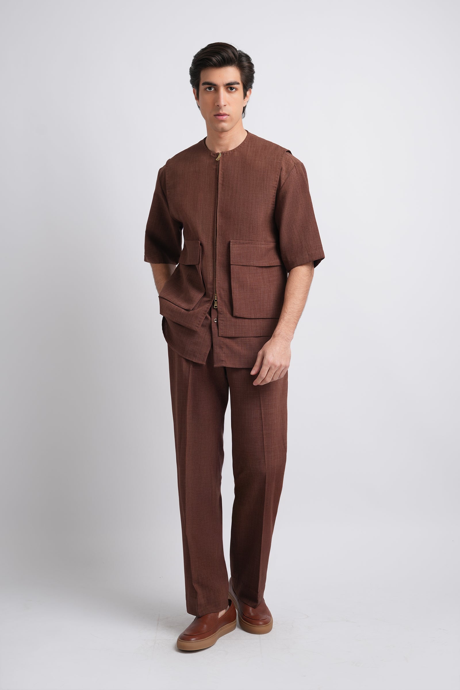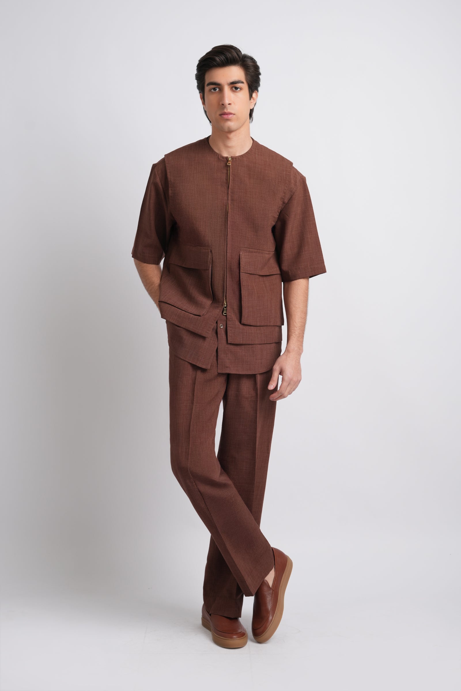 Redefine contemporary dressing with this 3-piece design from the LAB RECODED Collection. The structured waistcoat showcases a zipper closure and utility-inspired cargo pockets, complemented by a matching co-ord set. A round-neck top with center-front button detailing and a rounded hem is paired with straight-fit pants, creating a versatile silhouette that blends style with ease.