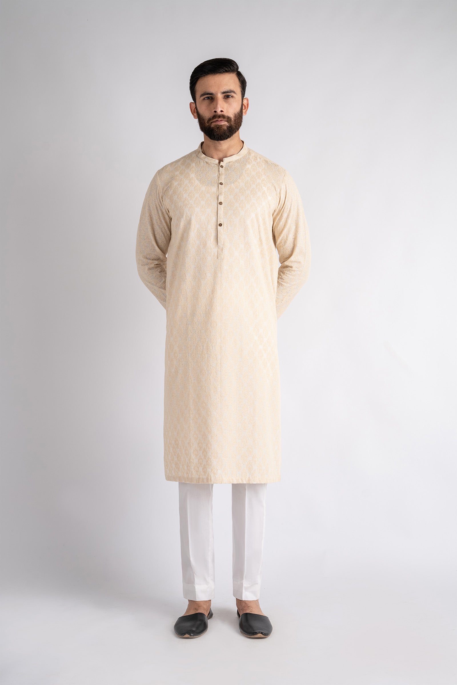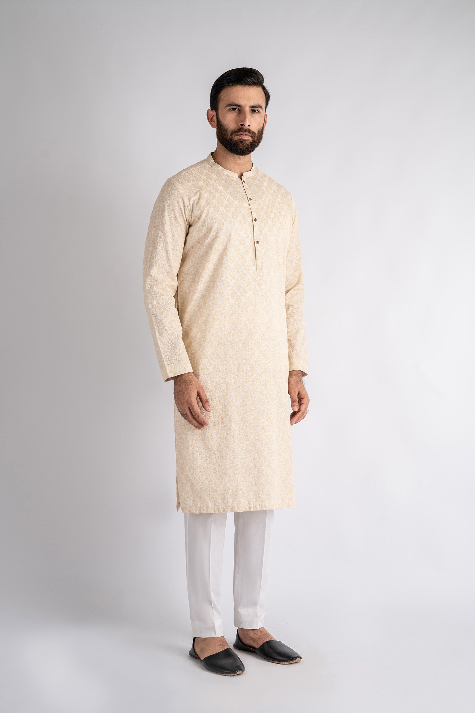 classic Kurta silhouette, cut from the finest Cotton; Fully embroidered with signature patterns and designs. A versatile piece which is a style-statement in its own right.