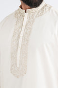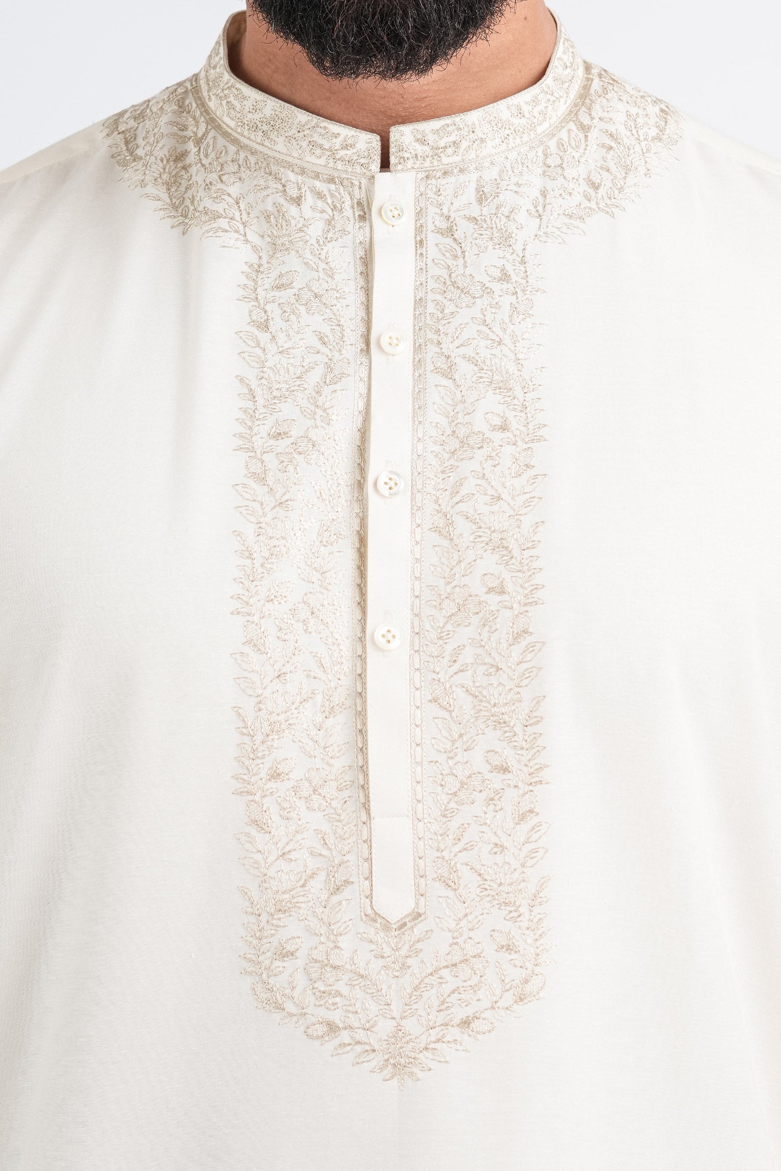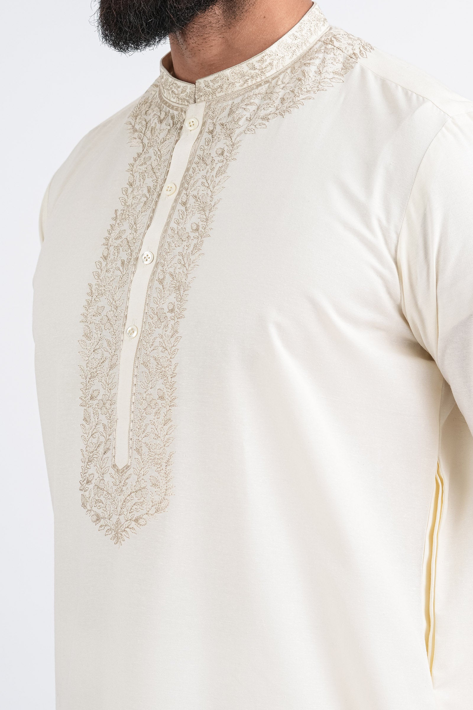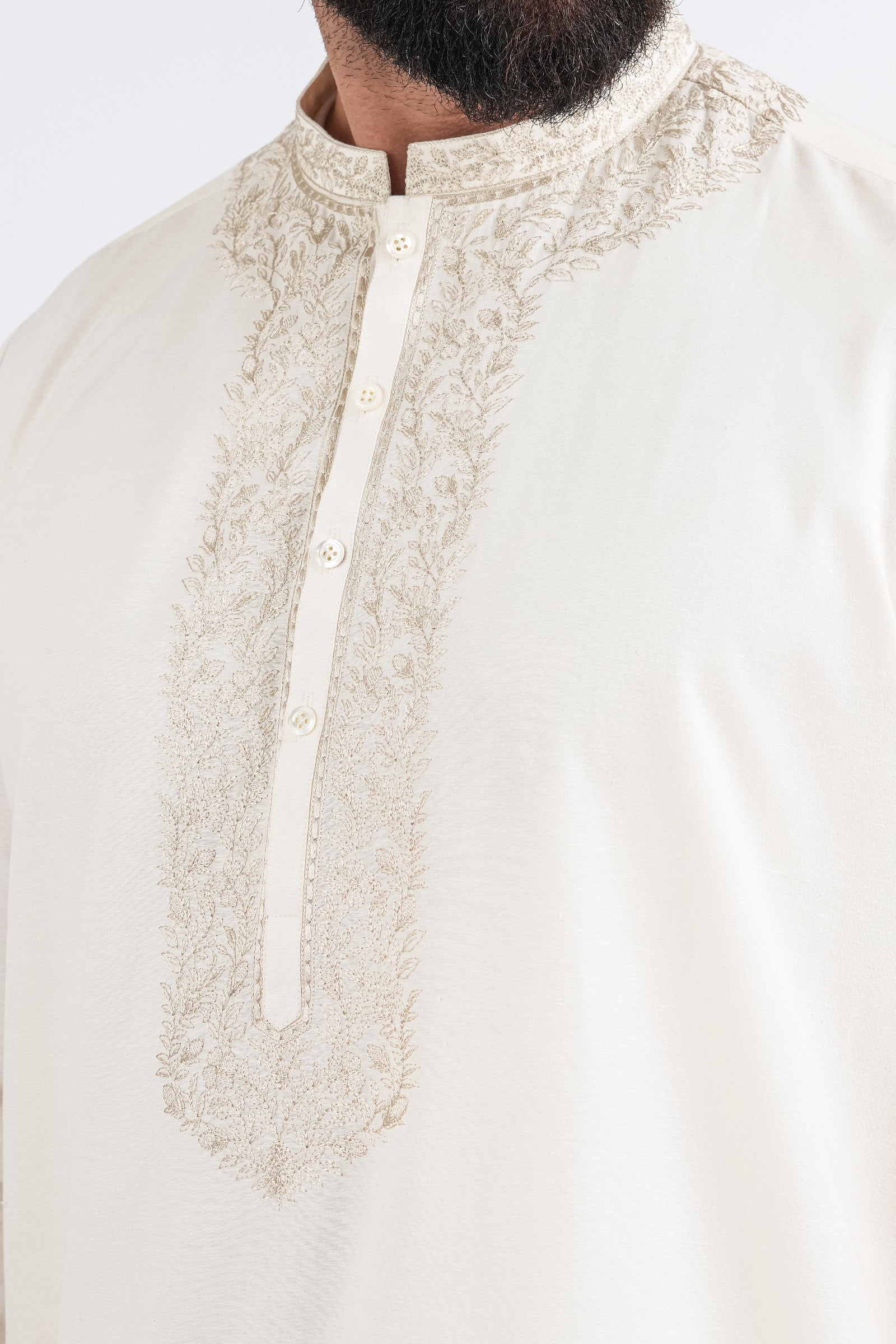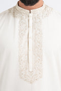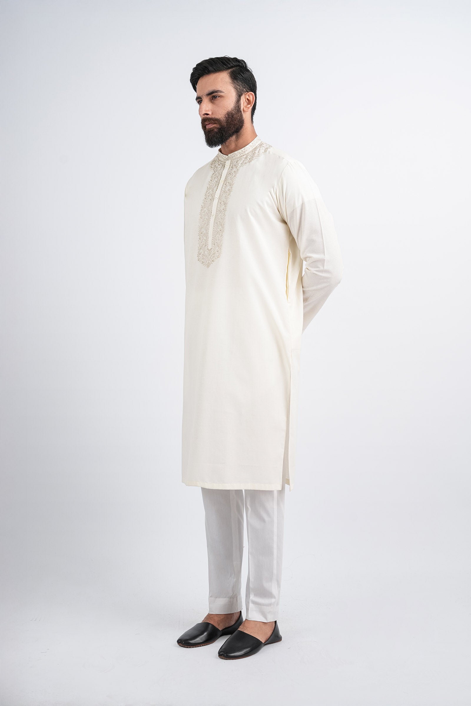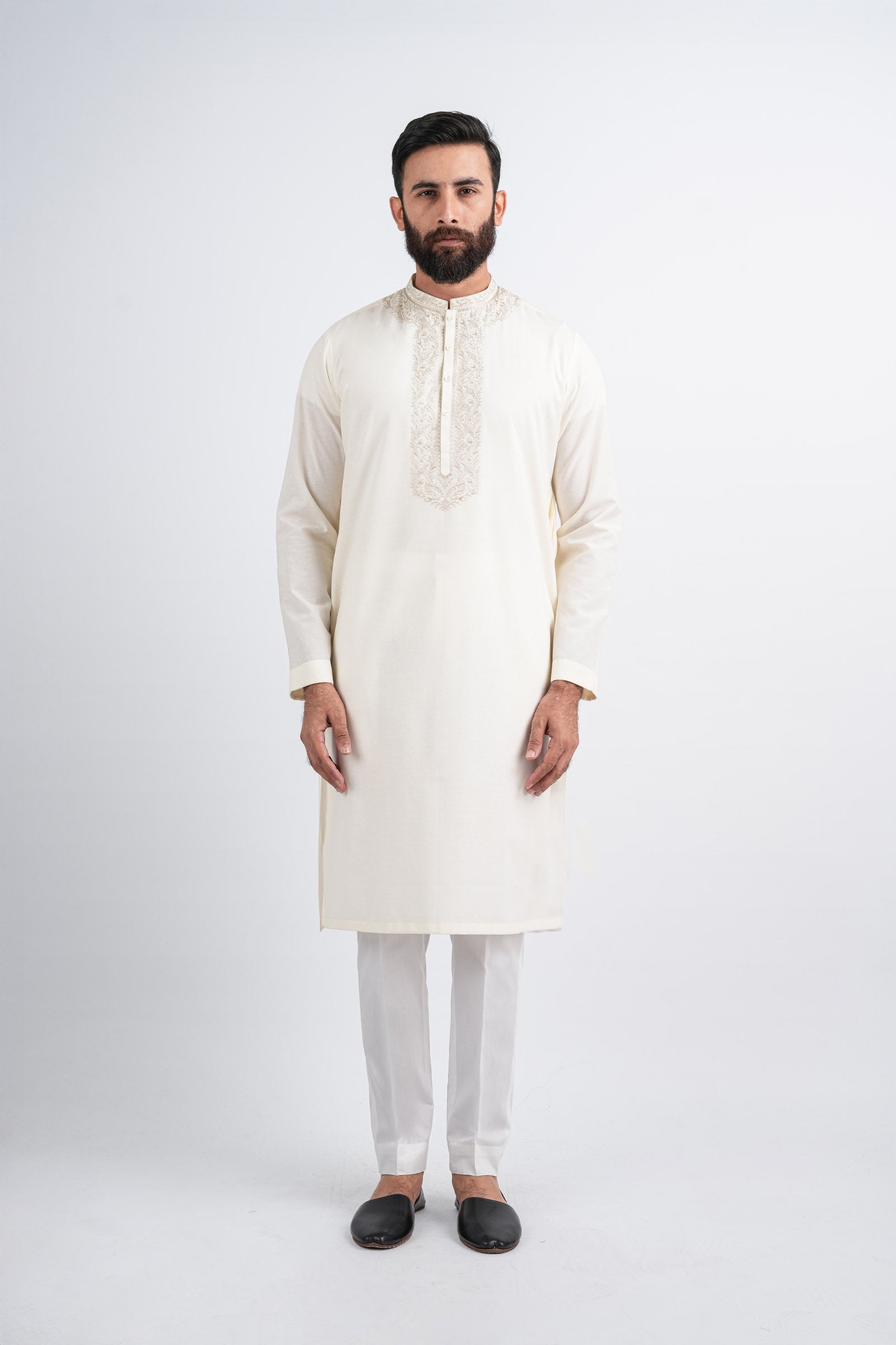 Elevate your wardrobe with this impeccably crafted kurta, tailored in a classic silhouette and cut from premium Crystal Karandi. Adorned with intricate signature embroidery around the placket, it blends timeless elegance with understated sophistication. Versatile and effortlessly stylish, this piece stands as a statement on its ownÑperfect for both festive and refined everyday wear.