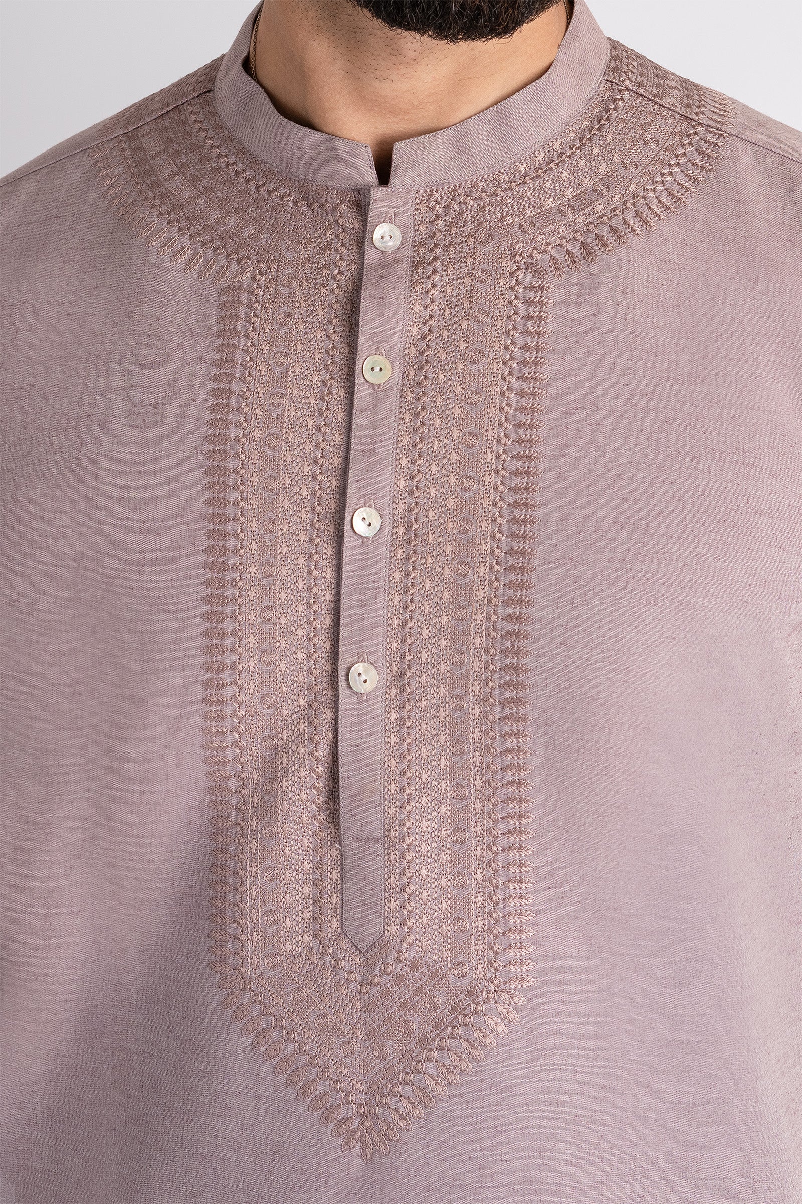 classic Kurta silhouette, cut from the finest Karandi Fabric; Embroidery around the placket. A versatile piece which is a style-statement in its own right.