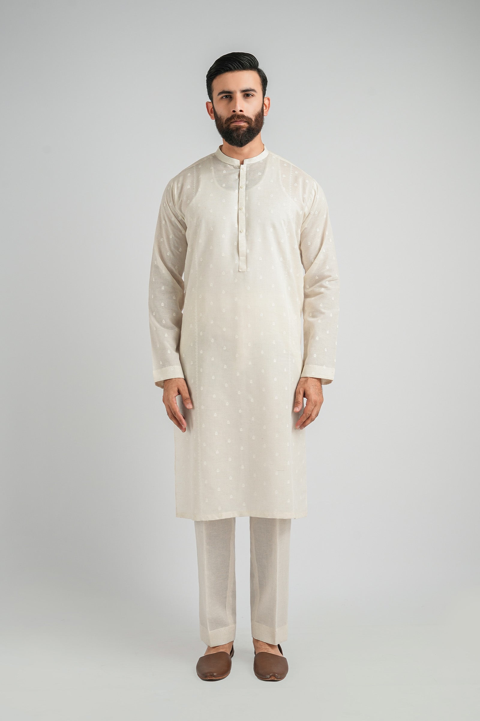 This signature kurta-trouser ensemble blends modern style with timeless elegance. Crafted from Cotton linen, the regular length kurta features delicate all-over embroidery detailing, a mandarin collar, and a Visible placket, paired with straight-leg matching trouser for a polished silhouette. Perfect for festive occasions or refined everyday wear, it exudes effortless sophistication.