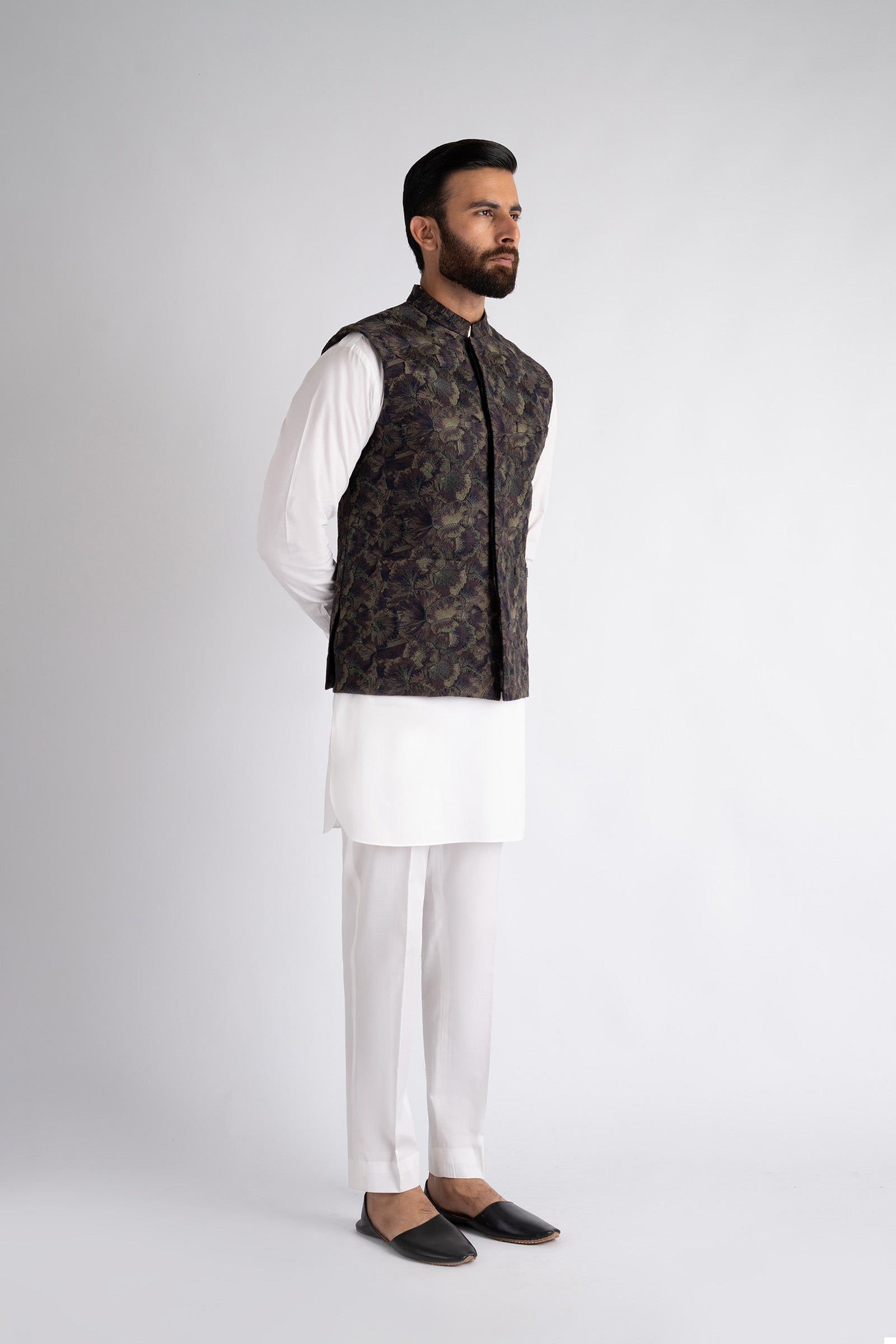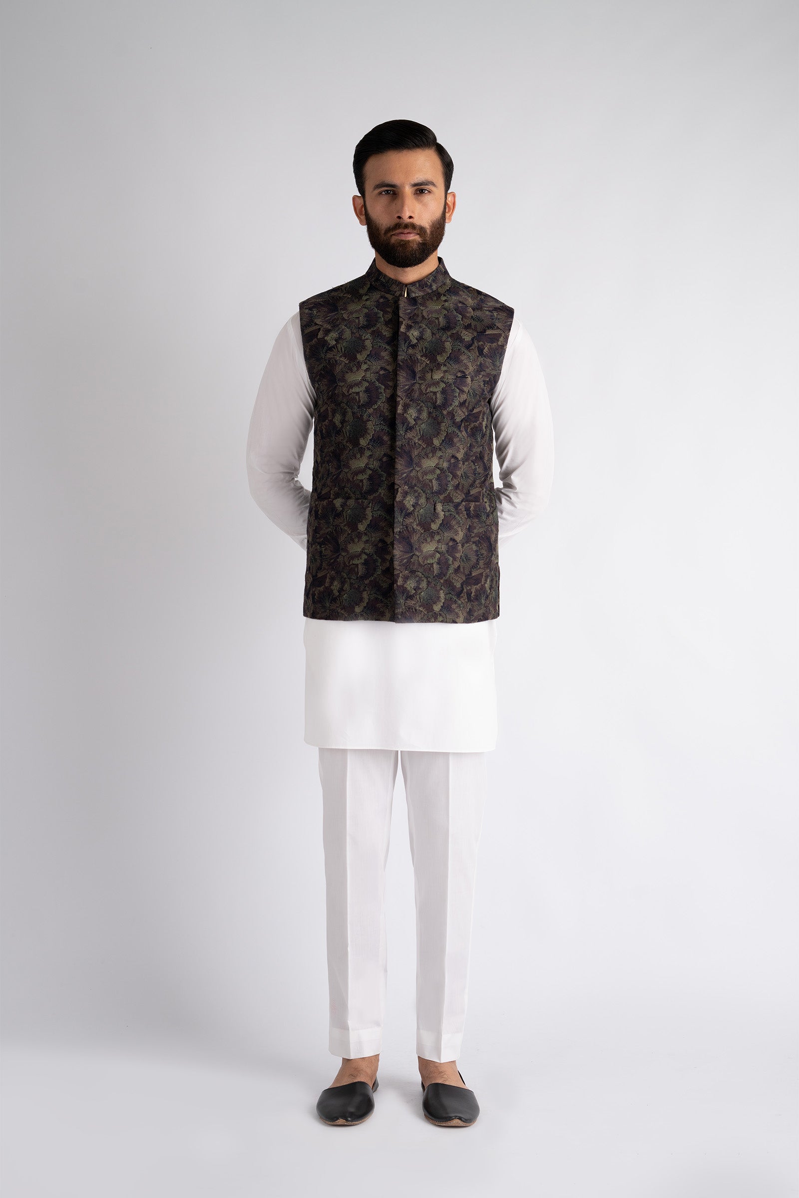 This premium waistcoat is crafted to make a lasting impression, featuring refined all-over embroidery, it offers a perfect balance of comfort and sophistication. Finished with a mandarin collar and straight hem, it adds a distinctive touch to any traditional ensemble.