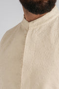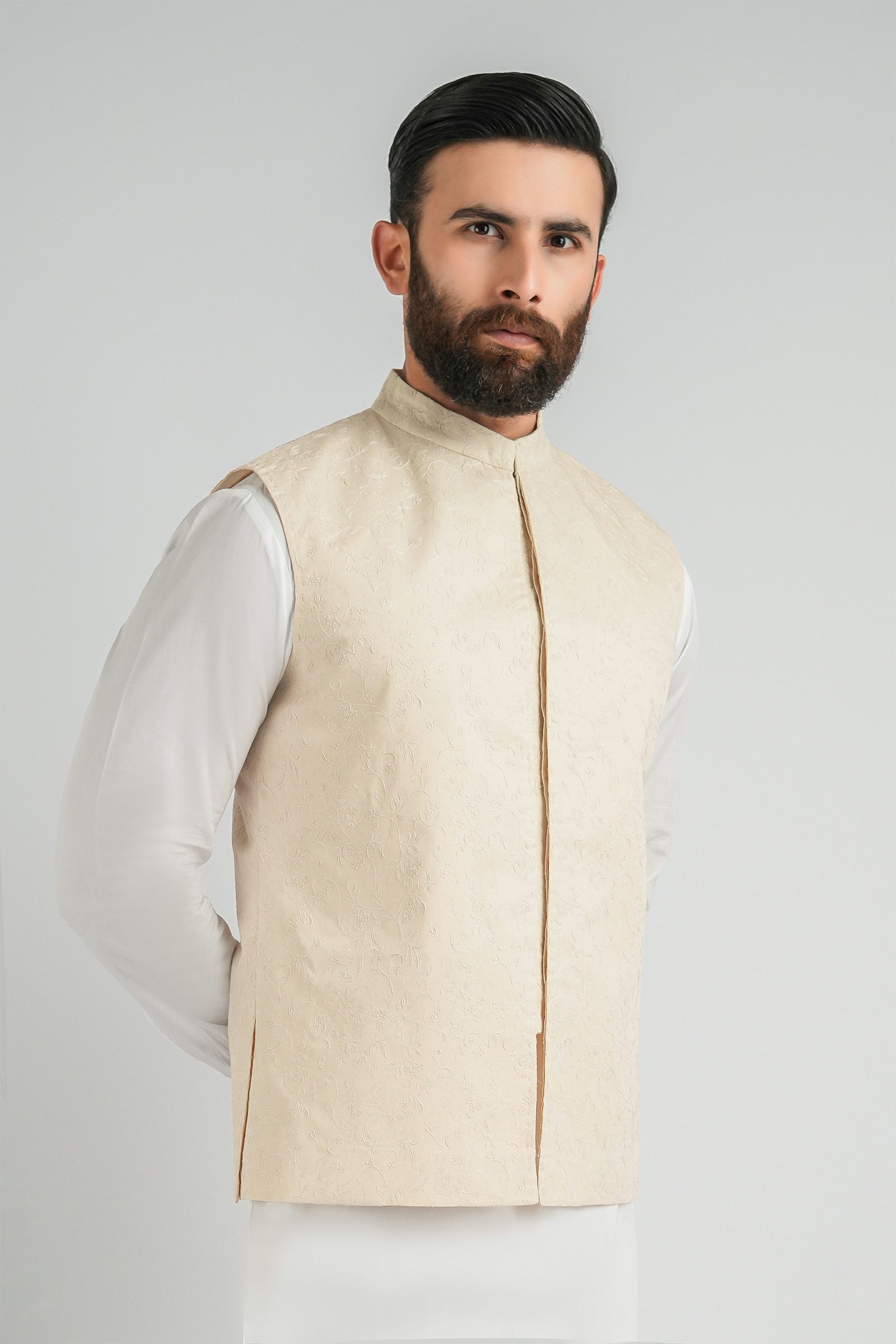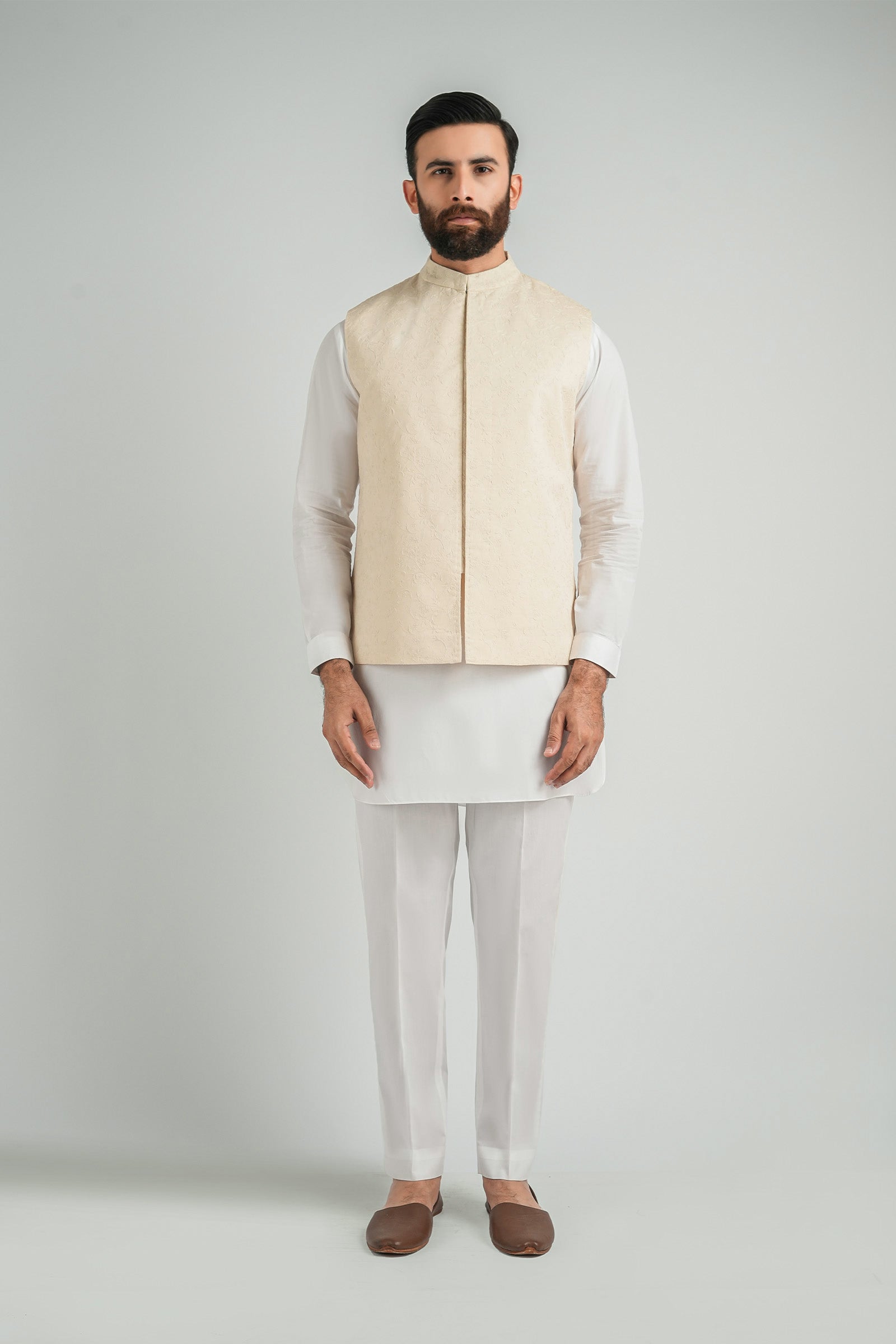 This premium waistcoat is crafted to make a lasting impression, featuring refined all-over embroidery. Tailored from Cotton Linen Fabric, it offers a perfect balance of comfort and sophistication. Finished with a mandarin collar and Straight hem, it adds a distinctive touch to any traditional ensemble.