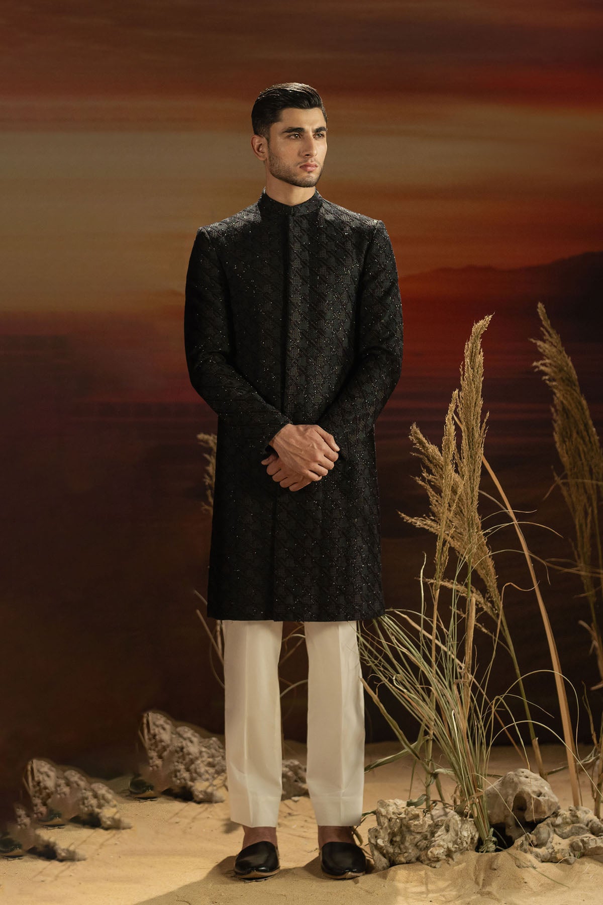 Black handloom viscose fabric sherwani with a blend of houndstooth and geometric pattern texture composed with hand embroidered surface all over with black beads and Resham knots in burgundy, green and blue.