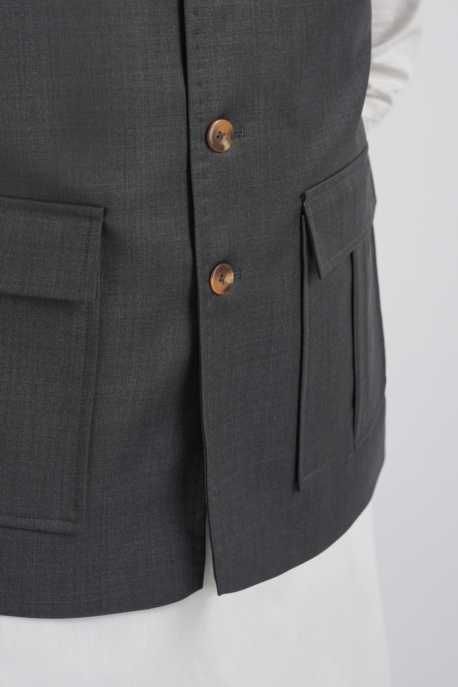 Designed with a refined Mandarin collar and a clean straight hem, it features a visible placket accented with elegant two-toned buttons. Functional Cargo pockets add structure while maintaining a sleek, polished silhouette.